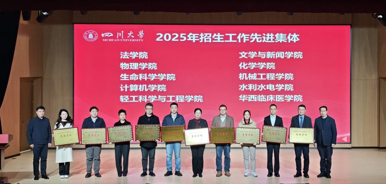 2025年12月17日,四川大学2025年本科招生工作总结会暨2026年招生工作启动会召开。会上,我院凭借扎实高效的工作表现,荣获“2025年招生工作先进集体”荣誉称号。这一殊荣既是学校对我院招生工作的高度认可,更是对全院上下凝心聚力推进招生工作的激励。